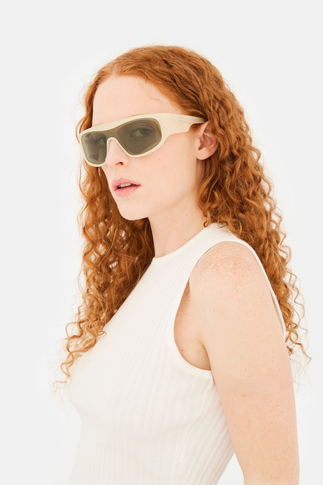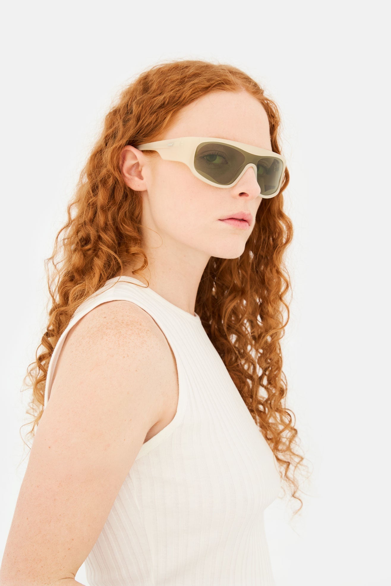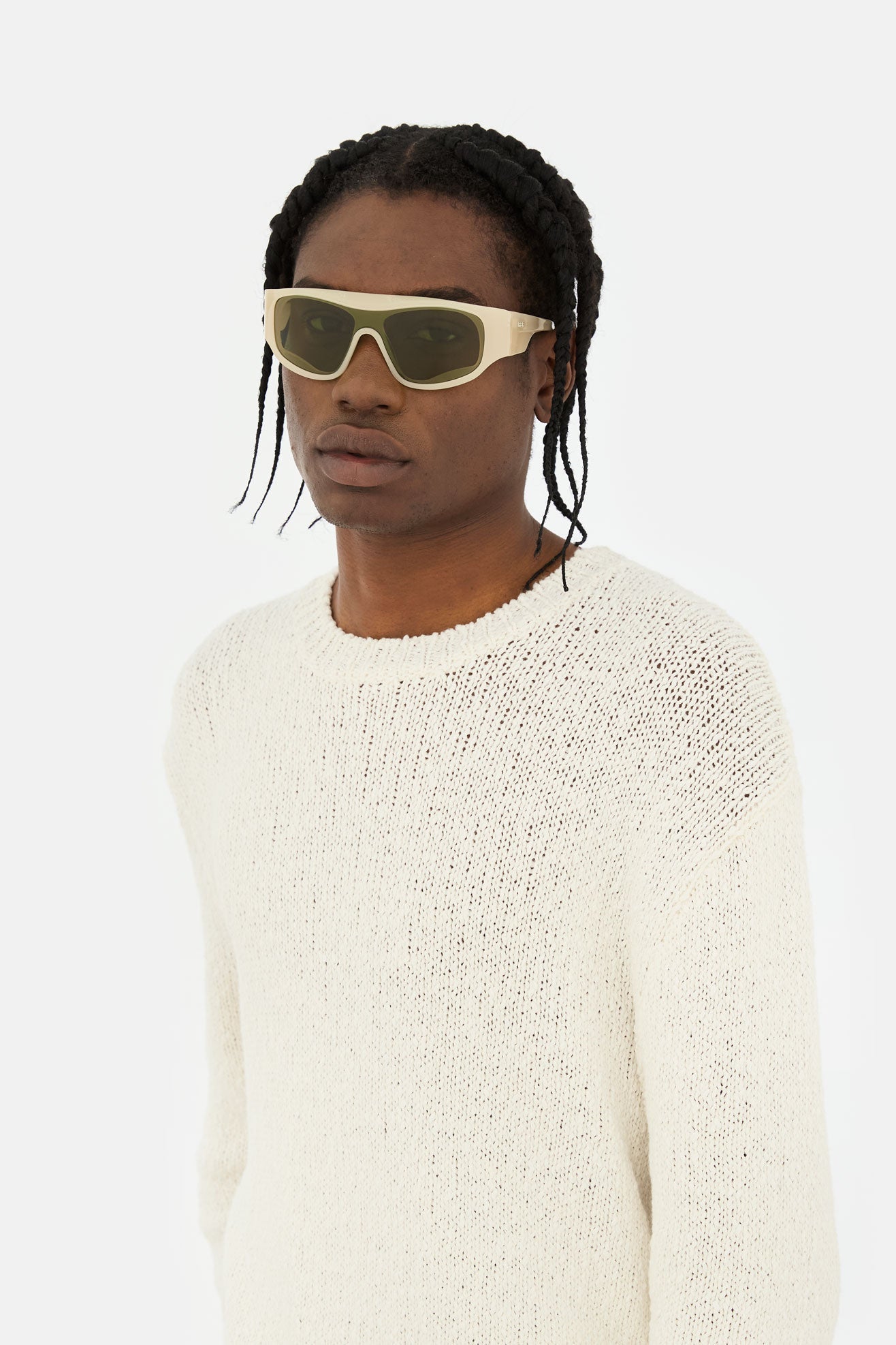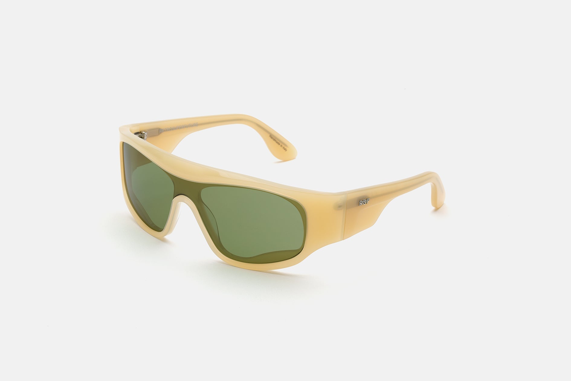 Acetato italiano de alta calidad en un acetato de arena del desierto ligero y suave. Montaje sobre escudo verde Zeiss en base 4. Gafas premium hechas a mano en Italia.