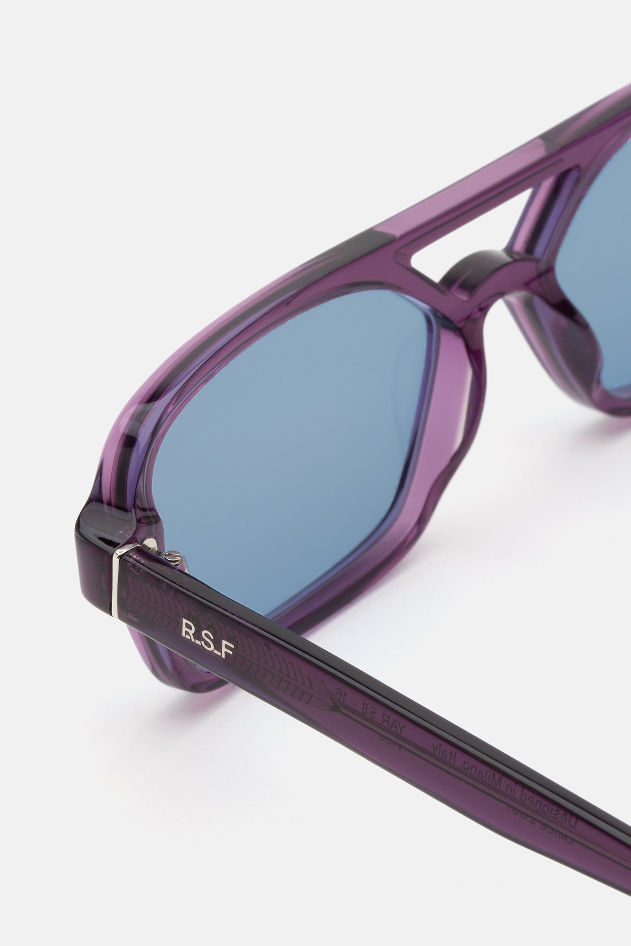 Acetato italiano de alta calidad en un sofisticado acetato berenjena cristalino. Montura de divertidas lentes azules de Zeiss en base 4. Gafas de primera calidad hechas a mano en Italia.