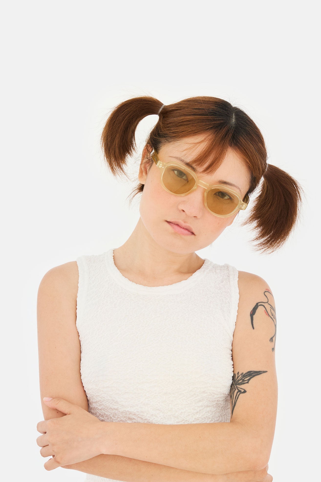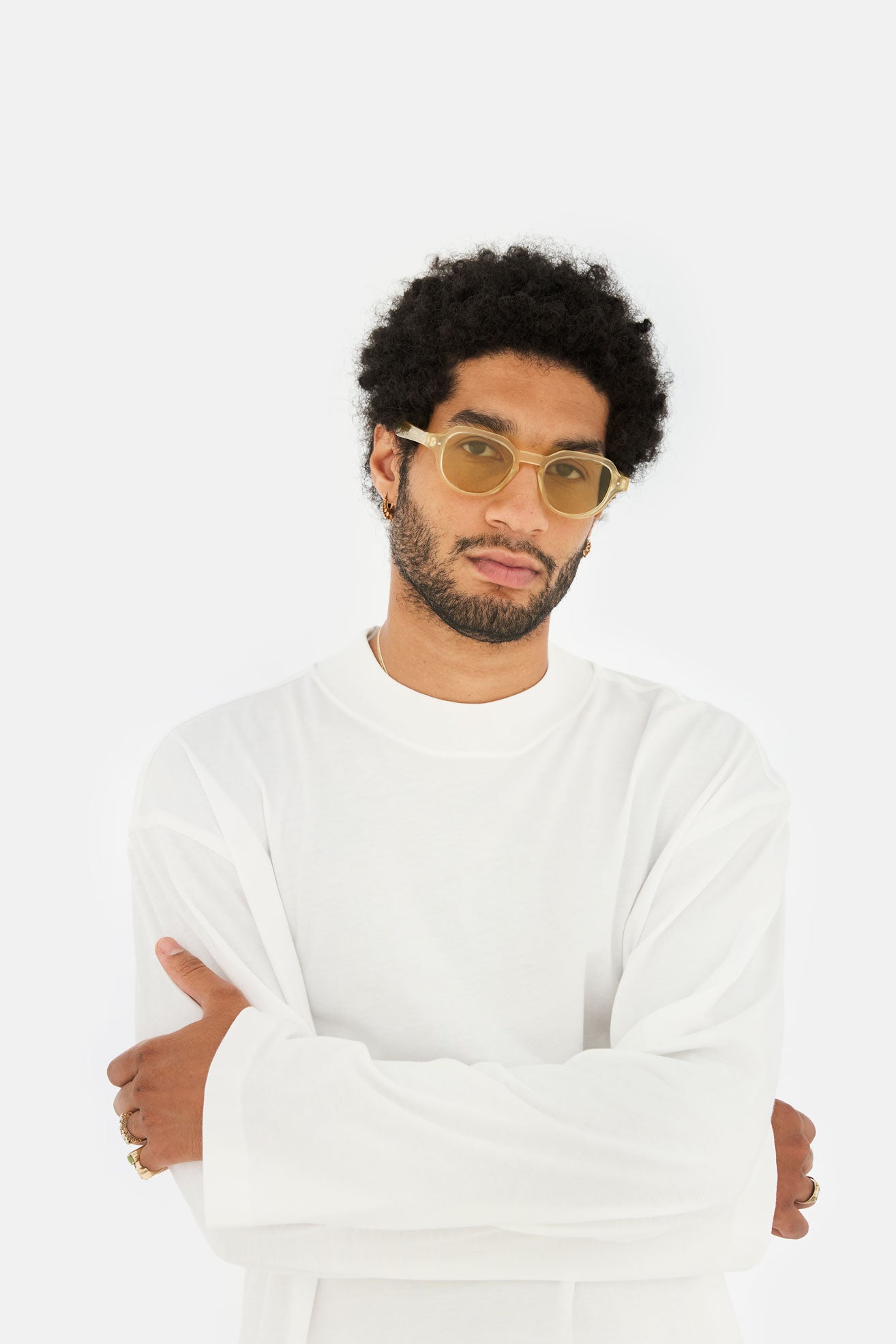 Voce presenta una montura redonda y elegante caracterizada por un lenguaje atemporal de sofisticación clásica. Su diseño esencial se completa con dos adornos de remaches metálicos en la montura frontal y patillas delgadas y flexibles de acetato en el lateral, lo que subraya su carácter refinado. Esta versión de Voce viene en un divertido acetato de color amarillo cristal con lentes de color amarillo suave a juego. Hecho a mano en Italia.