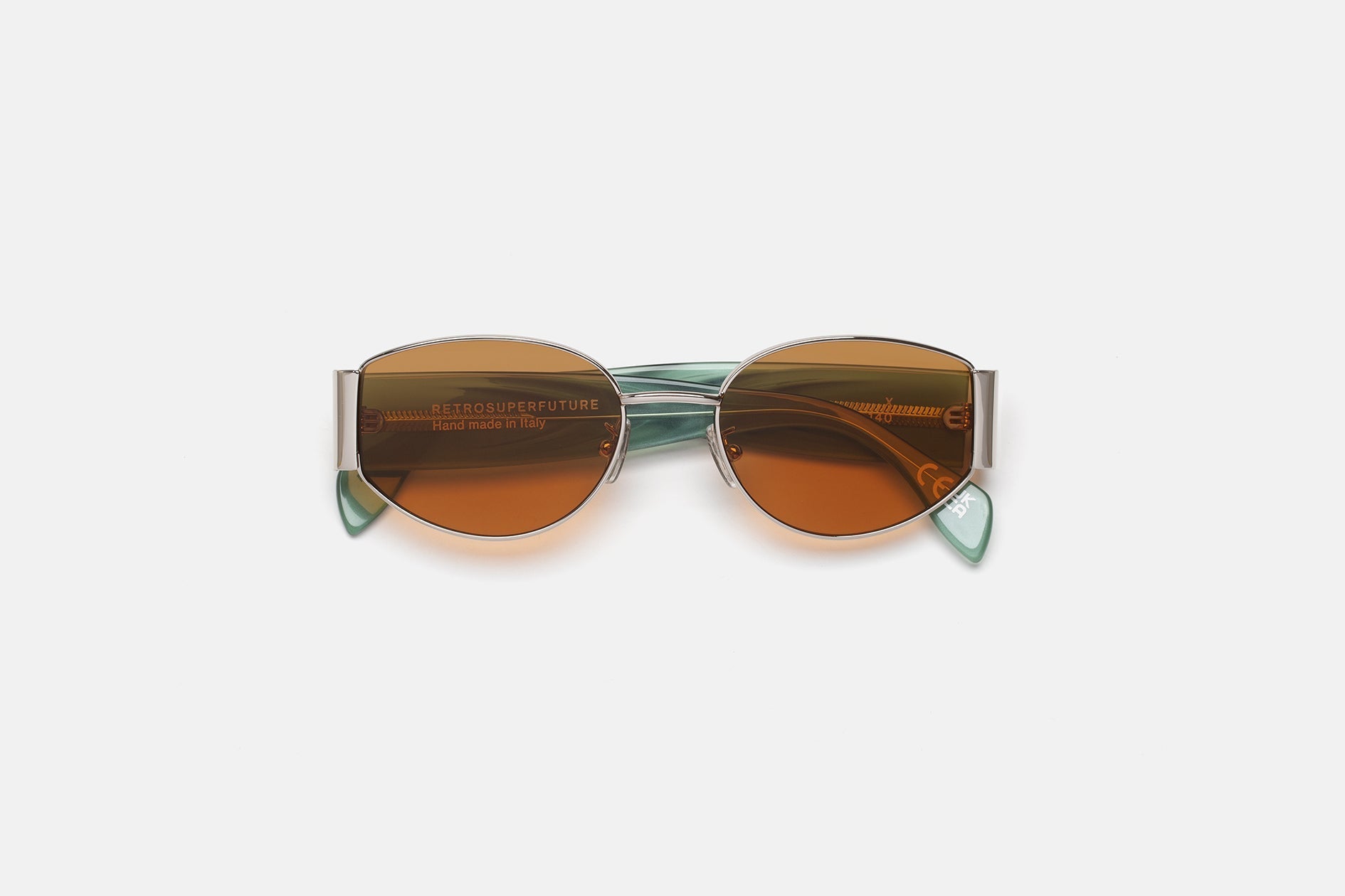 Metal plateado brillante de alta calidad y acetato italiano en un sofisticado acetato de color salvia cristalina. Montura de refinadas lentes Zeiss marrones en base 2. Gafas de primera calidad hechas a mano en Italia.