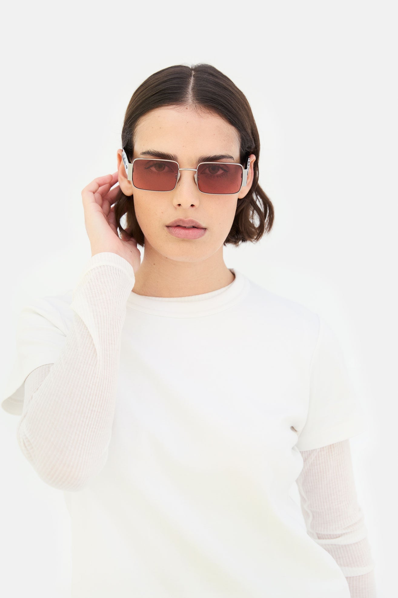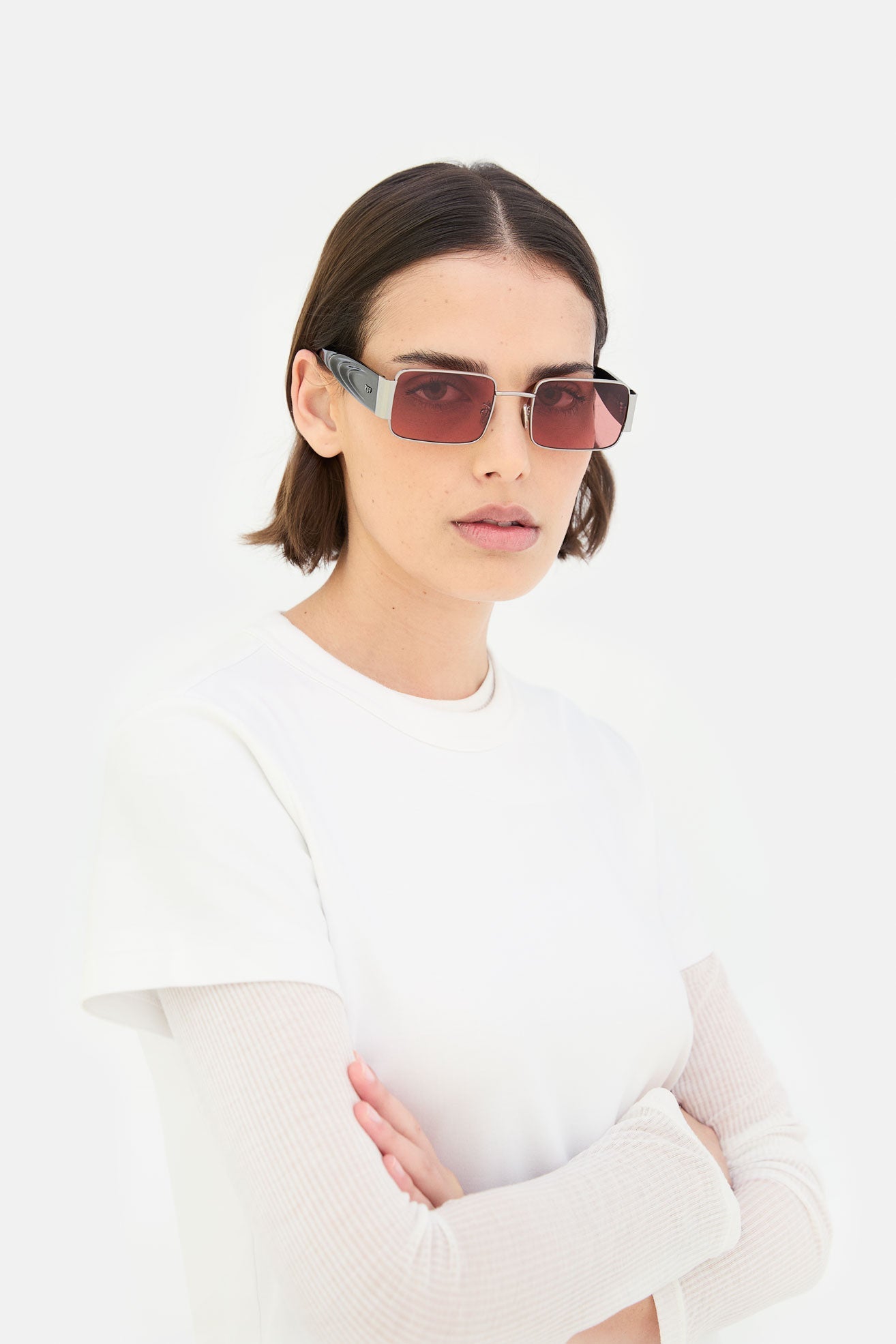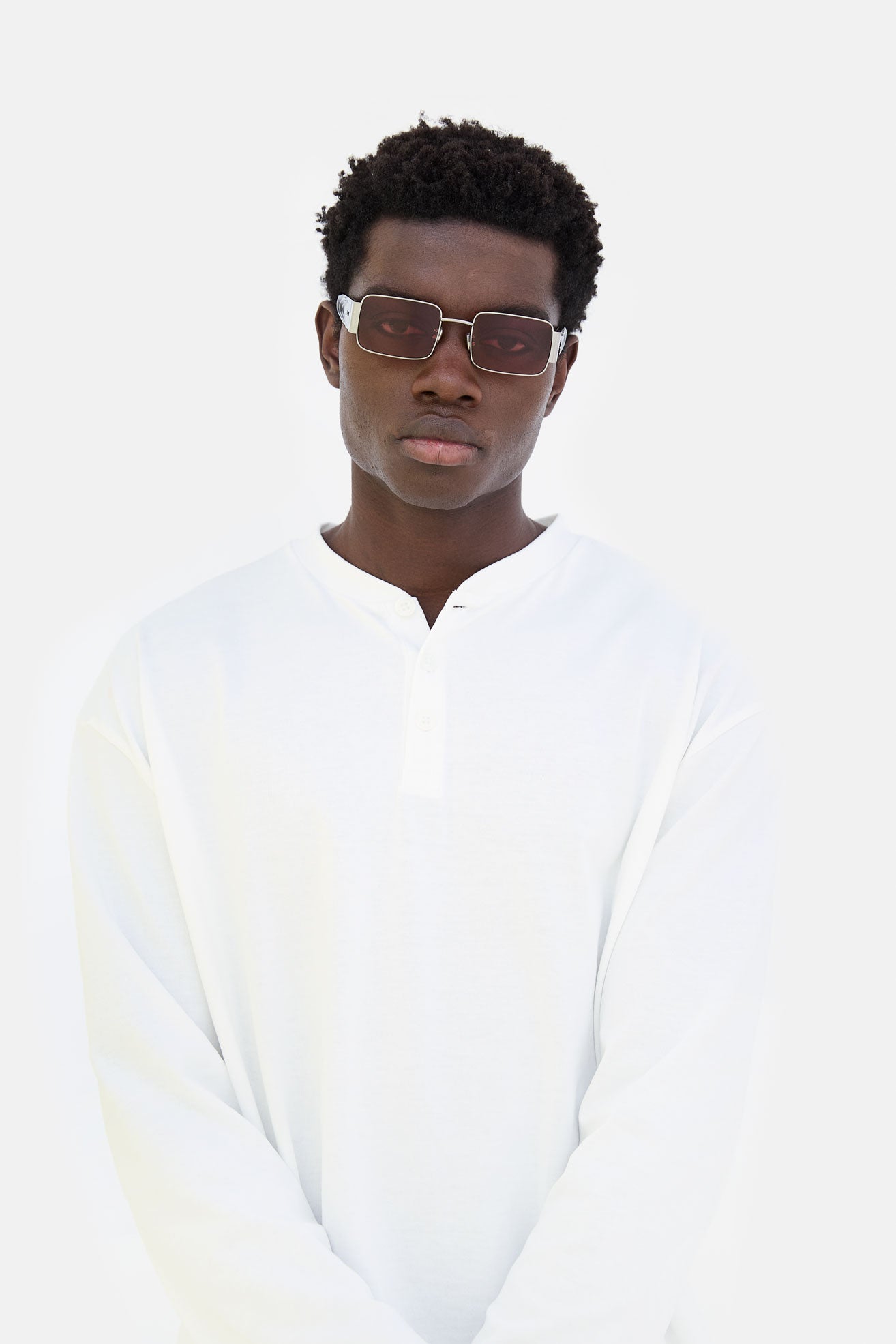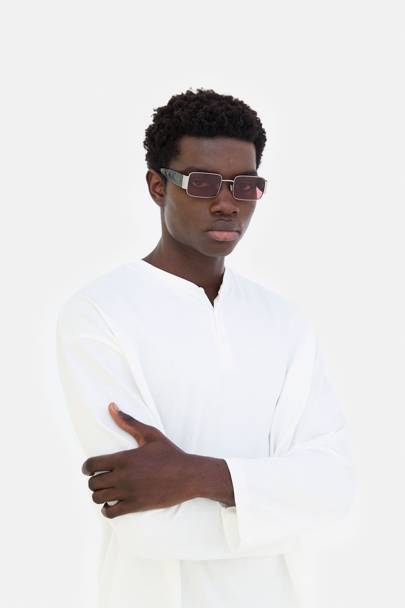 Z es suave. Sus lentes rectangulares esenciales están encerradas dentro de marcos de metal delgados pero resistentes que se envuelven en gruesas placas de metal para acomodar las altas patillas de acetato. Para contrarrestar este diseño esencial, casi minimalista, el Z presenta un toque orgánico único con una patilla de acetato termoformado con detalles que se asemejan a un anillo licuado de Saturno. Esta versión viene en un acabado de metal rutenio con patillas de acetato negro y lentes color vino.