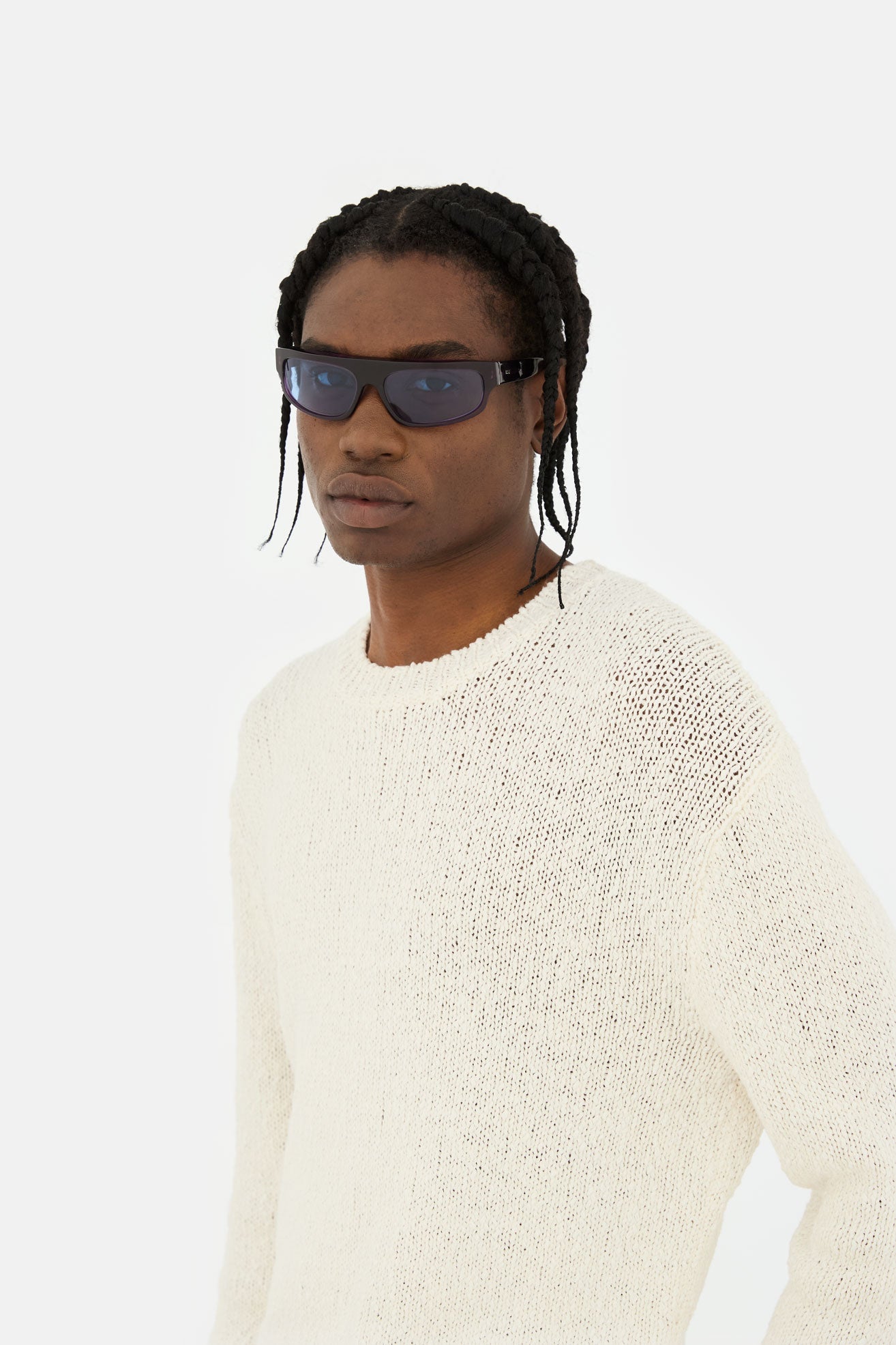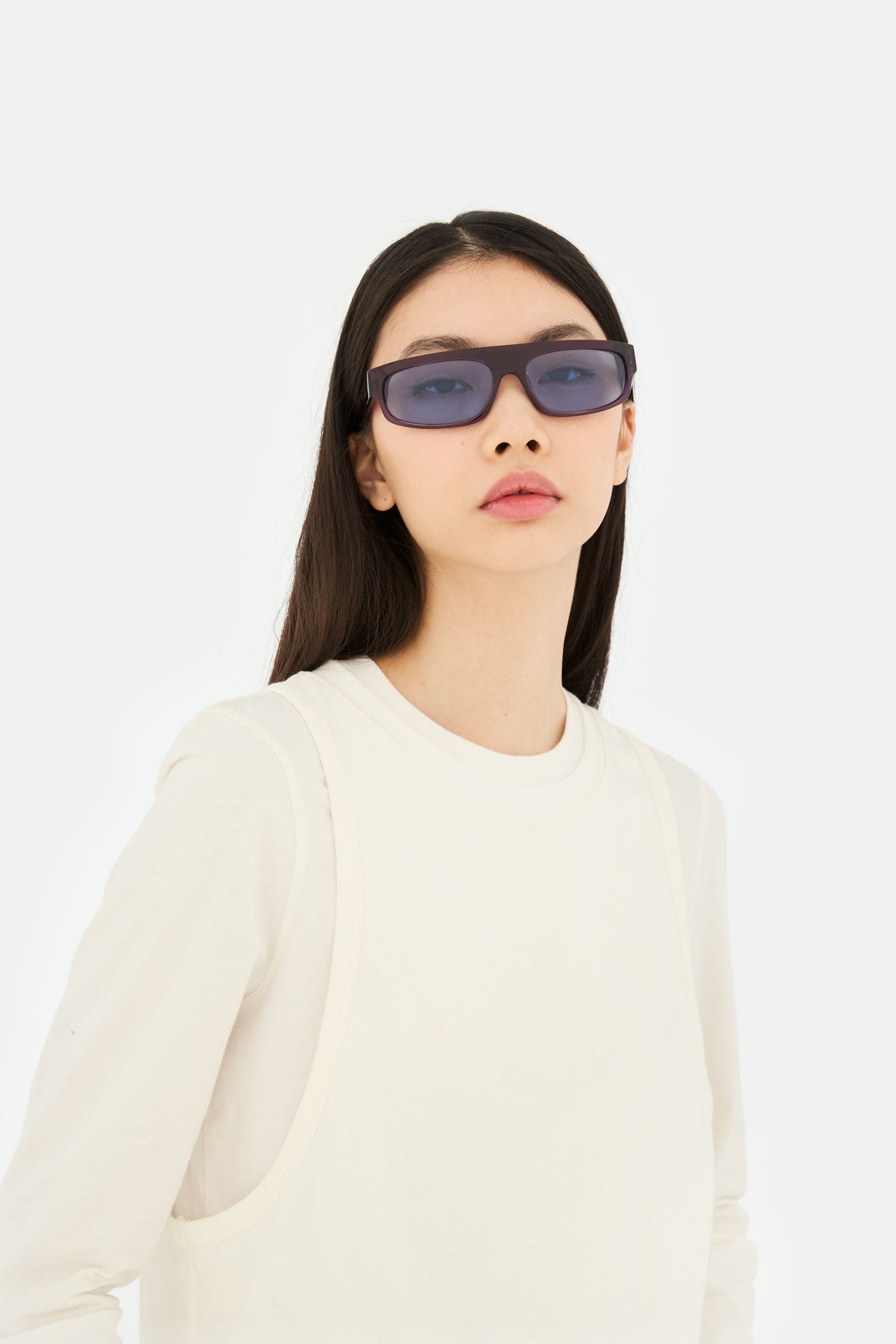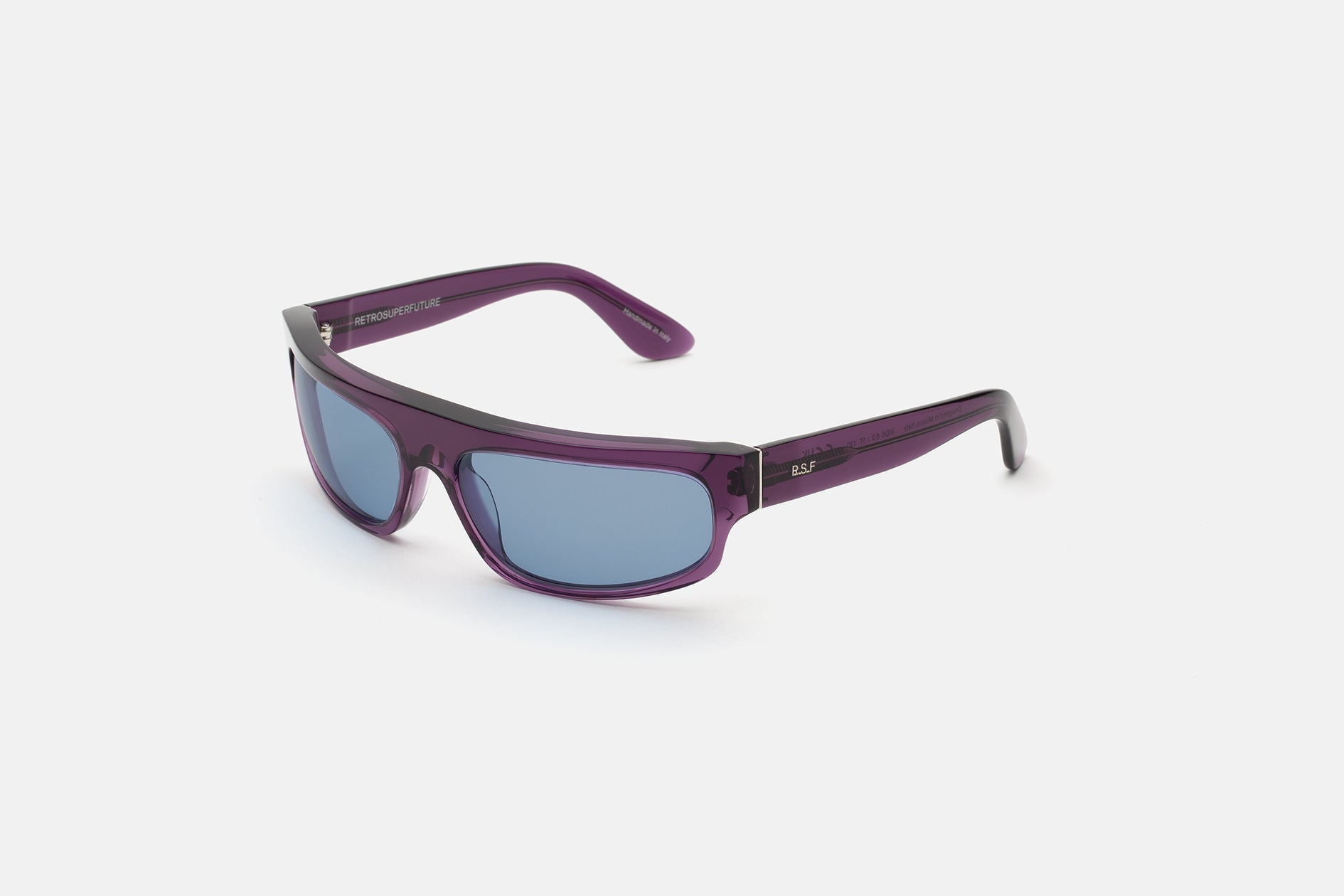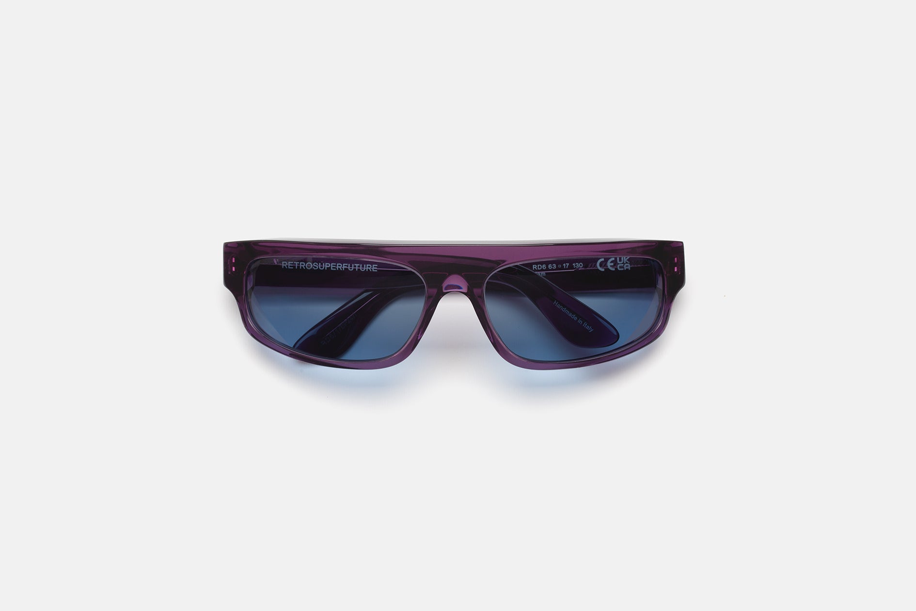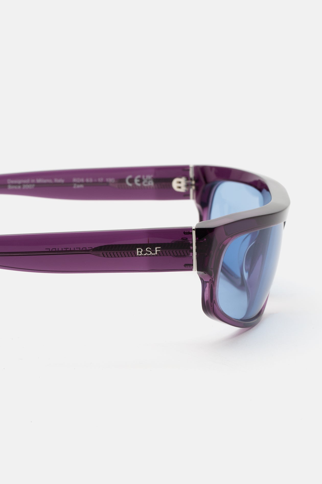 Acetato italiano de alta calidad en un sofisticado acetato color berenjena cristal. Lentes violetas alegres de base 8. Gafas de alta gama hechas a mano en Italia.