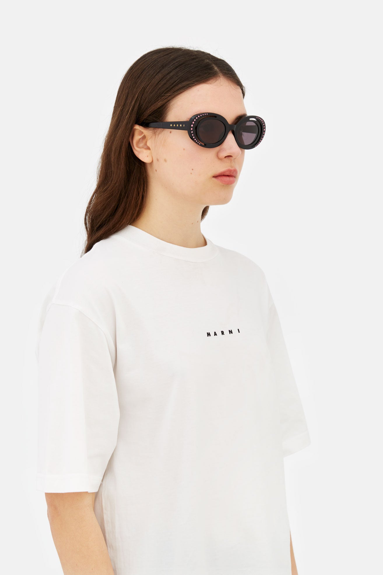 Diseñada en exclusiva para Marni, Zion Canyon es una silueta única caracterizada por un diseño y una construcción innovadores e inesperados que elevan la montura ovalada. Los bordes curvilíneos y espaciales del modelo han sido completamente tallados para formar una media luna en el borde exterior. Las sofisticadas gemas incrustadas en los anillos externos de acetato realzan aún más la forma de la pieza, al tiempo que ponen de manifiesto la excepcional artesanía y el saber hacer del "made in Italy". Este modelo está disponible en acetato negro con lentes a juego.